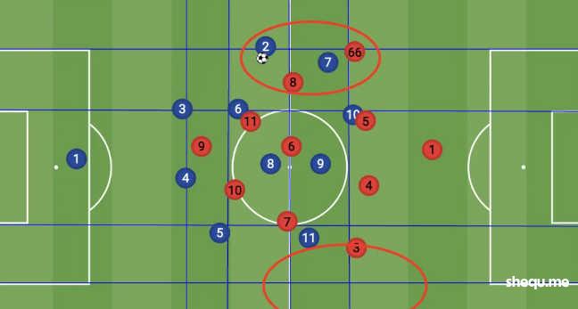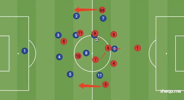 而中场中路有5人,使得球队在中路和肋部的推进当中局部区域有压倒性的过载优势。