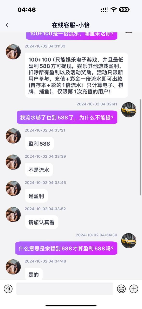 说是首存100+100一杯流水盈利588即可提现。我打到590提现显示差流水,客服说要盈利588,我又打到710提现还是不给出,各种理由不给出款,黑台大家避雷